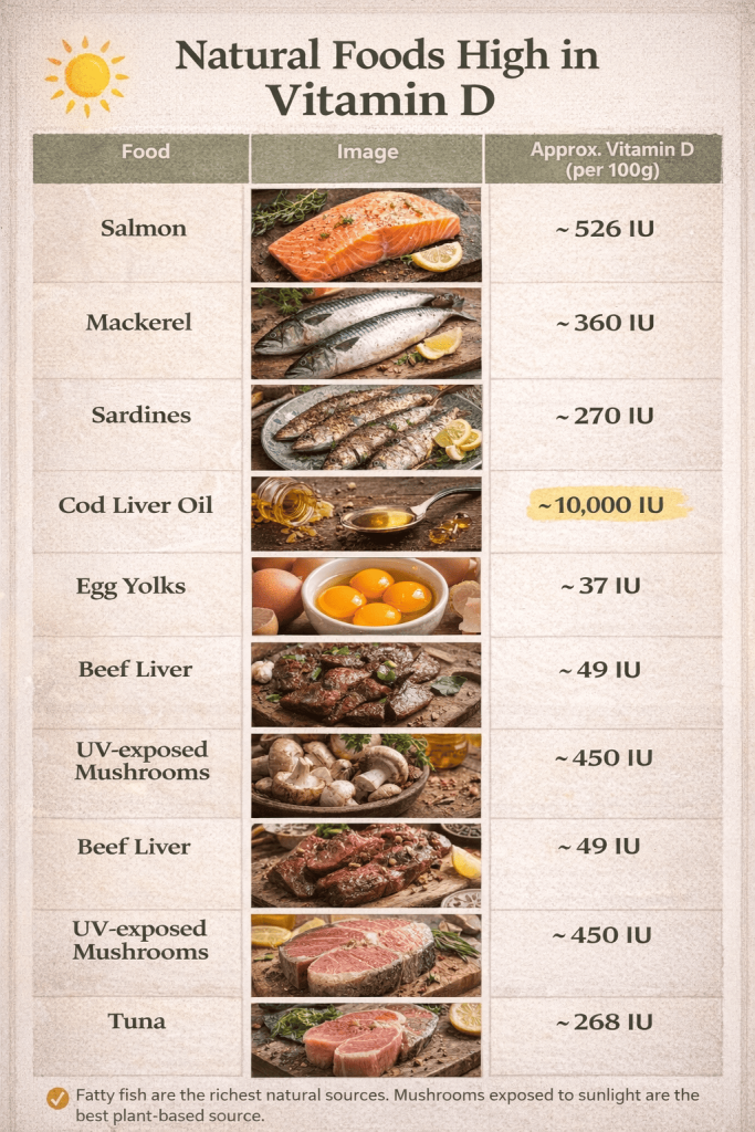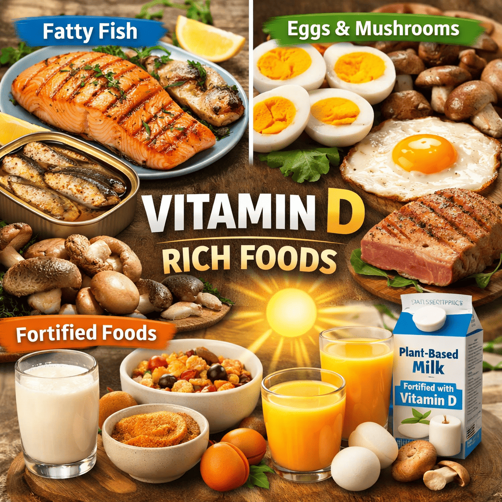 You can increase Vitamin D naturally by getting regular sunlight exposure (15–30 minutes daily), eating fatty fish like salmon and sardines, consuming egg yolks, mushrooms, and fortified dairy products.