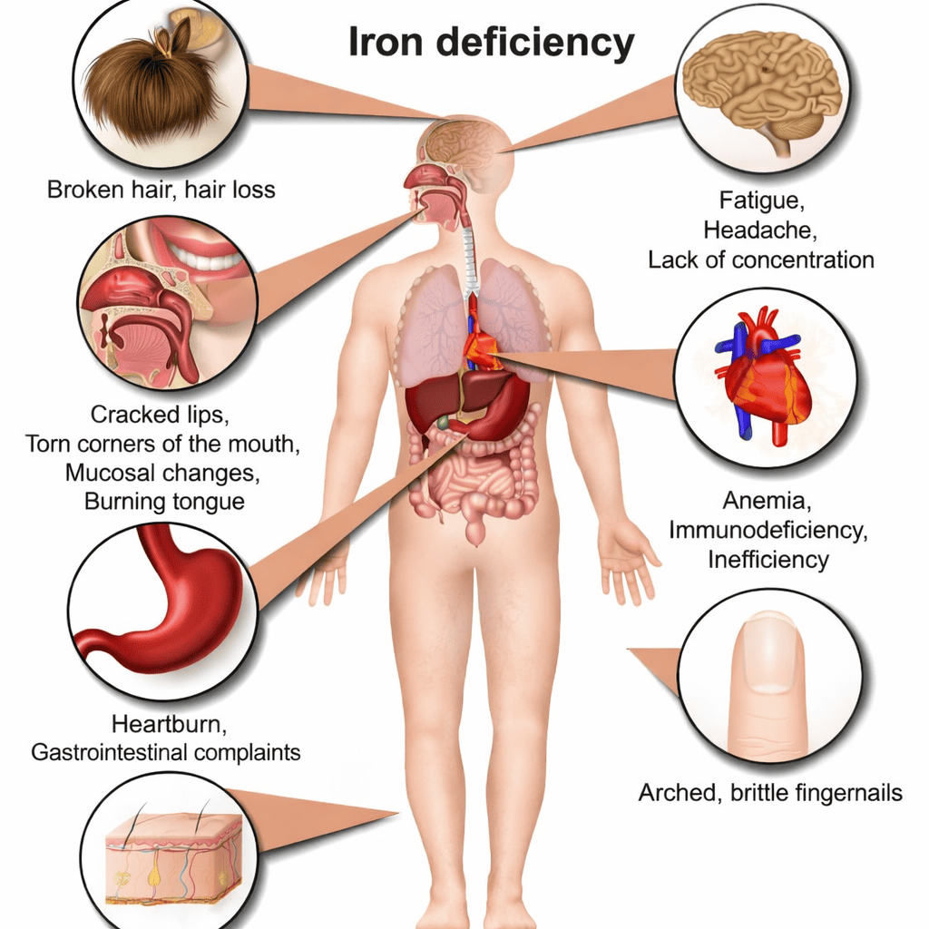 Common signs of iron deficiency include fatigue, pale skin, dizziness, shortness of breath, brittle nails, and headaches. A blood test is the best way to confirm low iron levels.