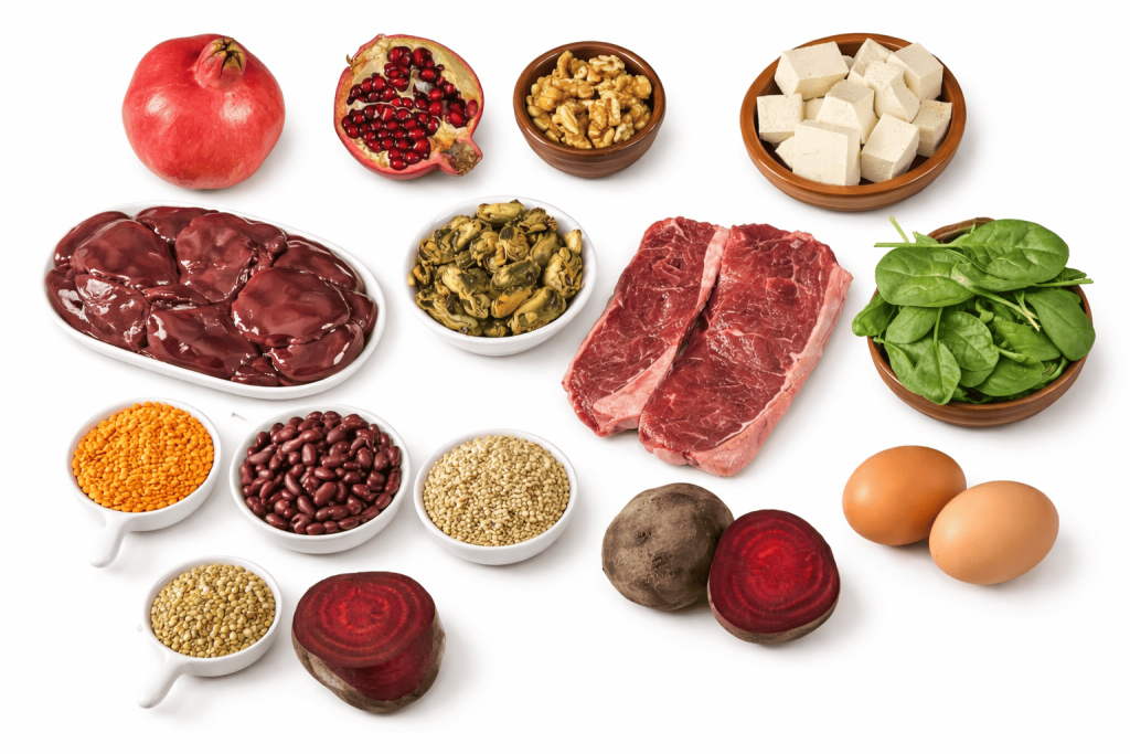Pair iron foods with vitamin C (oranges, lemon, tomatoes) to improve absorption.